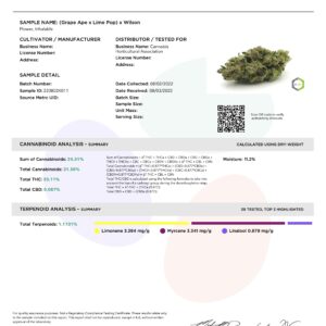 Grape Ape x Lime Pop The (Grape Ape x Lime Pop) reeks of grapes and bright citrus lime terps. Leaves you continuously wanting to smell a cured jar of flowers over and over. Beautiful purple hues with large yielding flowers.
